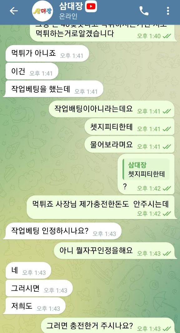 60만원 충전 후 100만원 환전하려 하니 갑자기 작업 배팅이라며 지급을 거부하더라고요.