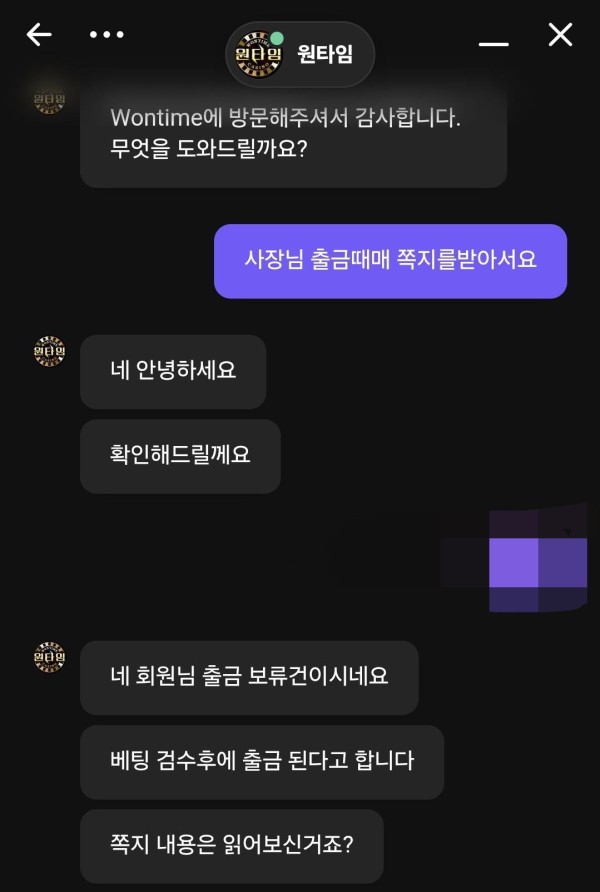 원타임카지노에서 당첨금 준다고 하길래 기다렸는데 결국 먹튀당했습니다.