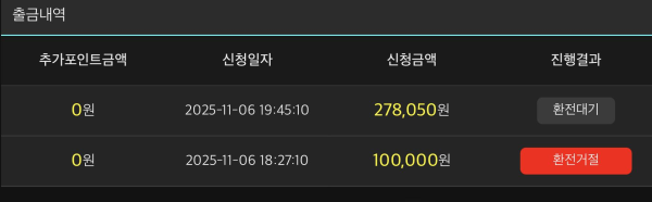 5만 포인트로 시작해서 10만원까지 만들었고 환전을 신청했는데요,