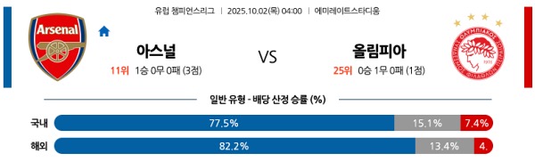 아스날은 요케레시의 침투와 외데고르의 템포 조율, 그리고 마두에케의 날카로운 돌파를 바탕으로 다양한 공격 루트를 활용할 수 있다. 여기에 세트피스 활용 능력이 더해지면 올림피아코스의 불안정한 수비 집중력은 버티기 힘들다. 반면 올림피아코스는 다수의 핵심 자원 부재와 전환 불안으로 인해 아스날의 강한 압박과 빠른 템포를 막아내기 어렵다. 홈 이점까지 감안하면 아스날이 경기를 지배하며 승리를 가져갈 가능성이 매우 높다.
