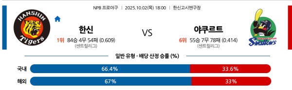 10월02일 NPB 일본야구분석 한신 vs 야쿠르트 스포츠분석픽, 스포츠뉴스