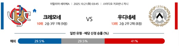 10월21일 세리에A 세리에분석 크레모네 vs 우디네세 칼초 스포츠분석픽, 스포츠뉴스