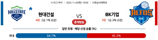 11월04일 여자V리그 한국배구분석 현대건설 vs IBK 기업은행 스포츠분석픽, 스포츠뉴스