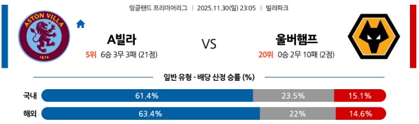 11월30일 EPL 이피엘분석 애스턴 빌라 vs 울버햄튼 스포츠분석픽, 스포츠뉴스