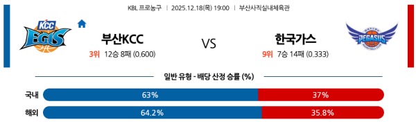 12월18일 KBL 한국농구 부산 KCC vs 대구 한국가스공사 스포츠분석픽, 스포츠뉴스