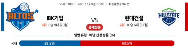 12월21일 여자V리그 한국배구 IBK 기업은행 vs 현대건설 스포츠분석픽, 스포츠뉴스