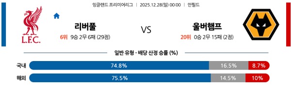 이 경기는 안필드 홈 경기라는 점에서 리버풀이 초반부터 점유율을 높이며 울버햄튼을 깊숙이 밀어넣는 전개가 유력합니다. 울버햄튼이 5-3-2로 박스 근처를 막아내려 하겠지만, 라인이 내려갈수록 미드필더와 수비 라인 사이 공간이 벌어질 가능성이 큽니다. 후반으로 갈수록 소보슬러이의 측면 전개와 맥 앨리스터의 하프스페이스 침투가 반복되면 울버햄튼 수비는 대응이 늦어질 수밖에 없는 구조입니다. 울버햄튼의 반격은 롱볼 기반 역습에 한정될 가능성이 높고, 공격 숫자 부족으로 실질적인 위협은 제한적일 전망입니다. 전력 구조와 경기 환경을 종합하면 리버풀이 경기 후반 주도권을 확실히 잡고 승점 3점을 가져갈 가능성이 높은 매치업으로 판단됩니다.
