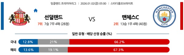 01월02일 EPL 이피엘분석 선덜랜드 vs 맨체스터 시티 스포츠분석픽, 스포츠뉴스