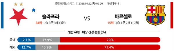 1월22일 UEFA 챔피언스리그분석 슬라비아 프라하 vs FC 바르셀로나 스포츠분석픽, 스포츠뉴스