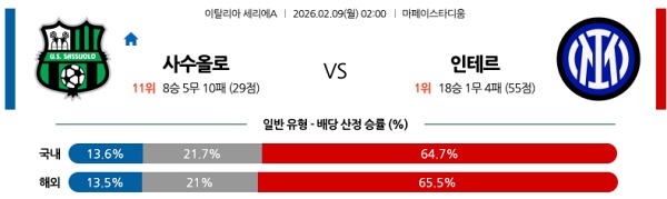 2월09일 세리에A 세리에분석 사수올로 vs 인터 밀란 스포츠분석픽, 스포츠뉴스