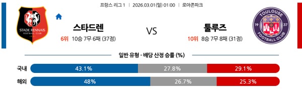 3월01일 리그앙 프랑스리그분석 스타드 렌 FC vs 툴루즈 FC 한국농구 스포츠분석픽, 스포츠뉴스