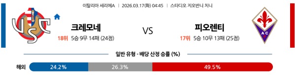 3월17일 세리에A 세리에분석 크레모네 vs 피오렌티나 스포츠분석픽, 스포츠뉴스
