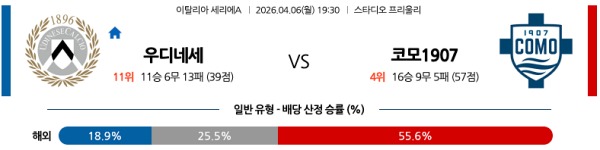4월06일 세리에A 세리에분석 우디네세 칼초 vs 코모 1907 스포츠분석픽, 스포츠뉴스