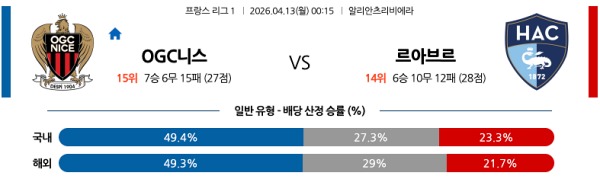 4월13일 리그앙 프랑스리그분석 OGC 니스 vs 르아브르 스포츠분석픽, 스포츠뉴스