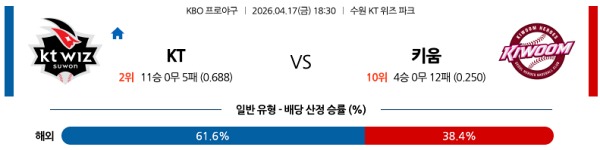 이번 경기는 초반 흐름보다 중반 이닝의 집중력이 승부를 가를 가능성이 높다. 키움이 초반 리드를 잡더라도 KT는 중반 이닝에서 타선 응집력을 바탕으로 흐름을 뒤집을 수 있는 팀이다. 특히 4~6회 구간에서 출루와 장타가 연결될 경우 단숨에 경기 주도권이 KT 쪽으로 넘어갈 가능성이 크다. 전체적인 경기 흐름과 추격 완성도를 고려하면 KT가 승리에 가까운 매치업이다.