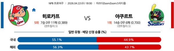 4월22일 NPB 일본야구분석 히로시마 vs 야쿠르트 스포츠분석픽, 스포츠뉴스