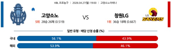 4월27일 KBL 한국농구분석 고양 소노 vs 창원 LG 스포츠분석픽, 스포츠뉴스