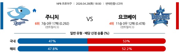 4월28일 NPB 일본야구분석 주니치 vs 요코하마 스포츠분석픽, 스포츠뉴스