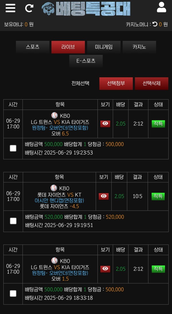 그래도 참고 다시 다른 경기에 배팅했는데, 그것마저 다 맞자 또 적특 처리했습니다.