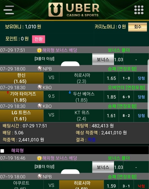 국내야구 3폴더를 적중시켜서 220만원이 당첨됐는데요.
