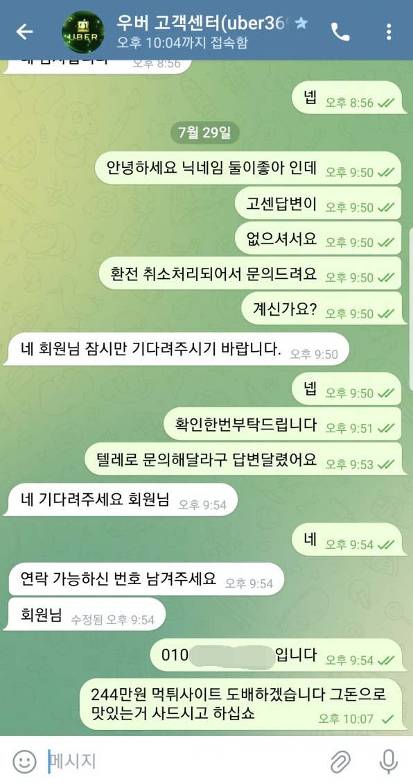 결국 텔레그램이랑 아이디까지 다 지워 버리고 사라졌습니다.