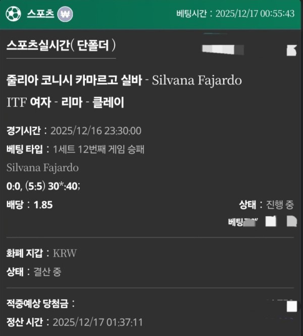 그런데 배팅 내역에는 어쩐지 미적중으로 표시되어 있더라고요.
