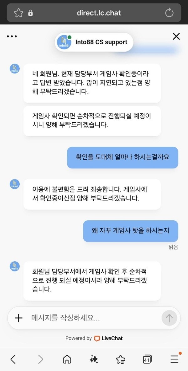 인투88 조금만 수 틀리면 바로 먹튀 때리고 잠수합니다.