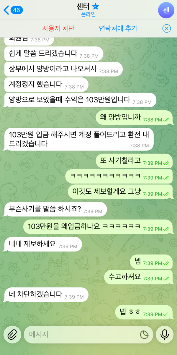 그래서 다른 커뮤니티에 피해 사실을 적었는데, 갑자기 연락이 와서 양방 배팅이라며 문제를 삼더라고요.