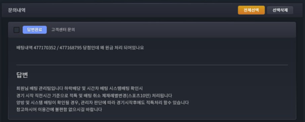 바로 문의했지만 악용 배팅이라는 말도 안 되는 이유를 들더라고요.