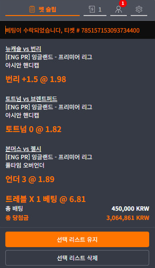 마지막에 30만원을 더 넣은 뒤 EPL 3폴더 배팅을 했습니다.