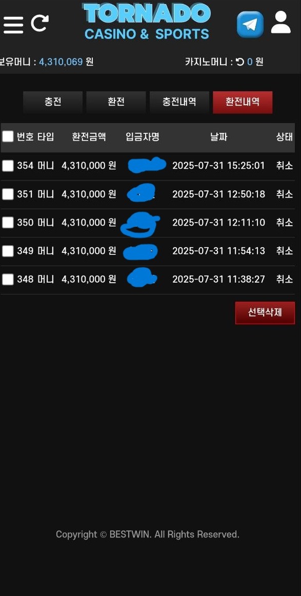 토네이도 먹튀사이트에서 350만원을 강제로 몰수당했어요.