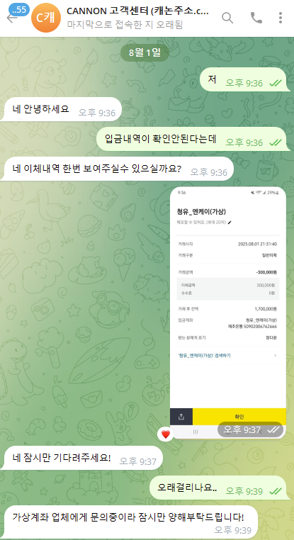 가상 계좌 오류라며 입금 확인이 안 된다고 하더니 한참 뒤에야 처리됐습니다.