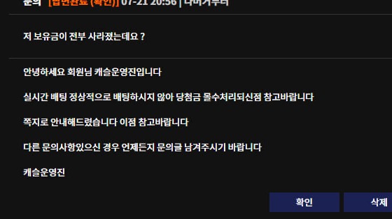 황당해서 고객센터에 문의했더니 제가 실시간 배팅을 정상적으로 하지 않았다고만 우기더라고요.