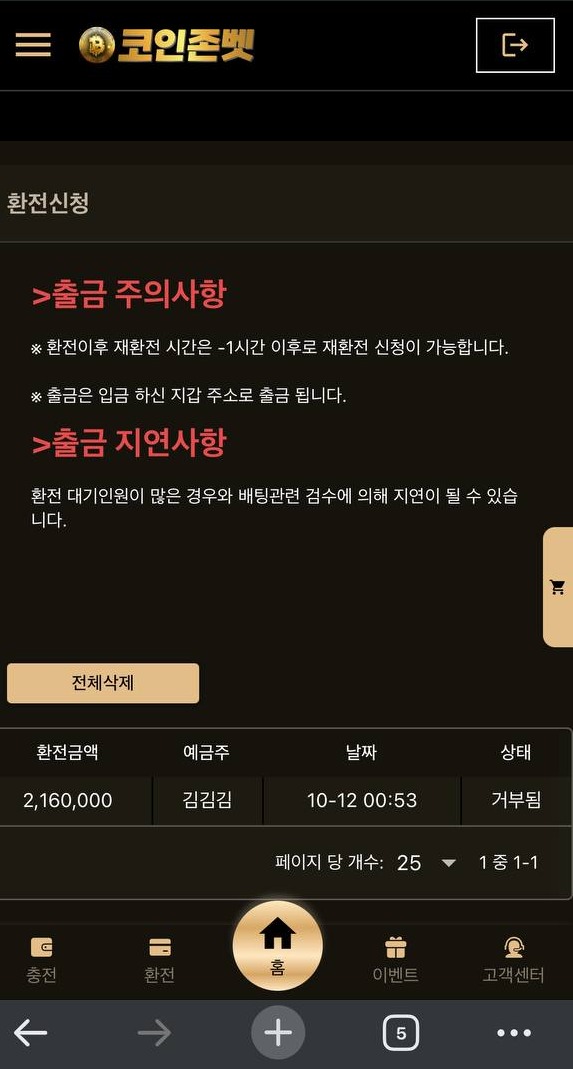 코인존벳 머리쓰는 운영자 덕에 당첨금 먹튀 당했습니다.