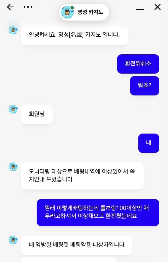 환전이 취소돼서 문의해 보니 갑자기 양방 배팅이라며 2주 치 계좌 내역을 요구했습니다.