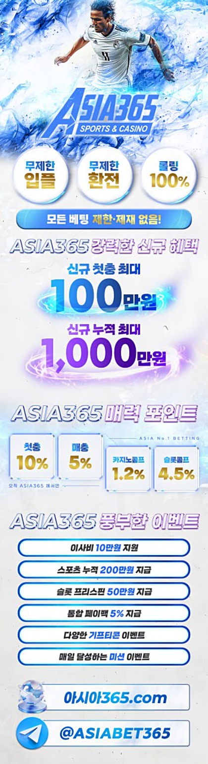 아시아365 여기 직원들이 일 처리 하나는 진짜 빠릅니다. 상담사도 전부 다 친절하고 이벤트까지 알아서 챙겨 주려고 하는 곳입니다. 아직 사용 안 해보신 분들은 구경이라도 해보세요.