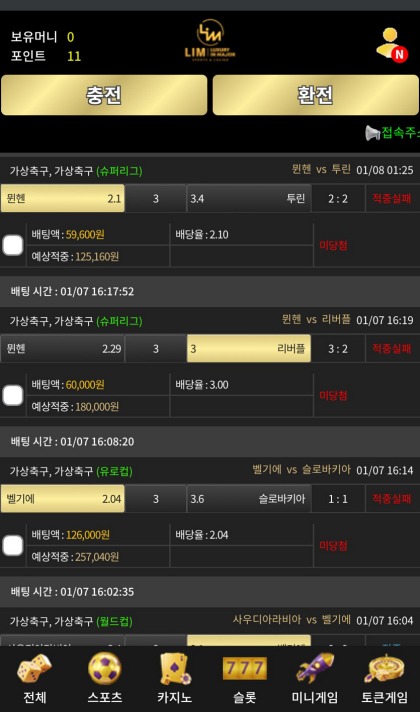 여기서 카지노, 슬롯, 스포츠 전부 다 이용해 봤는데요. 저는 가상 축구가