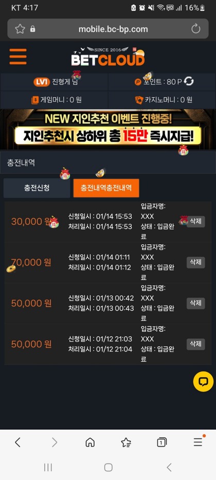 벳클라우드 충전 내역 공개 하면서 후기 남겨요.
